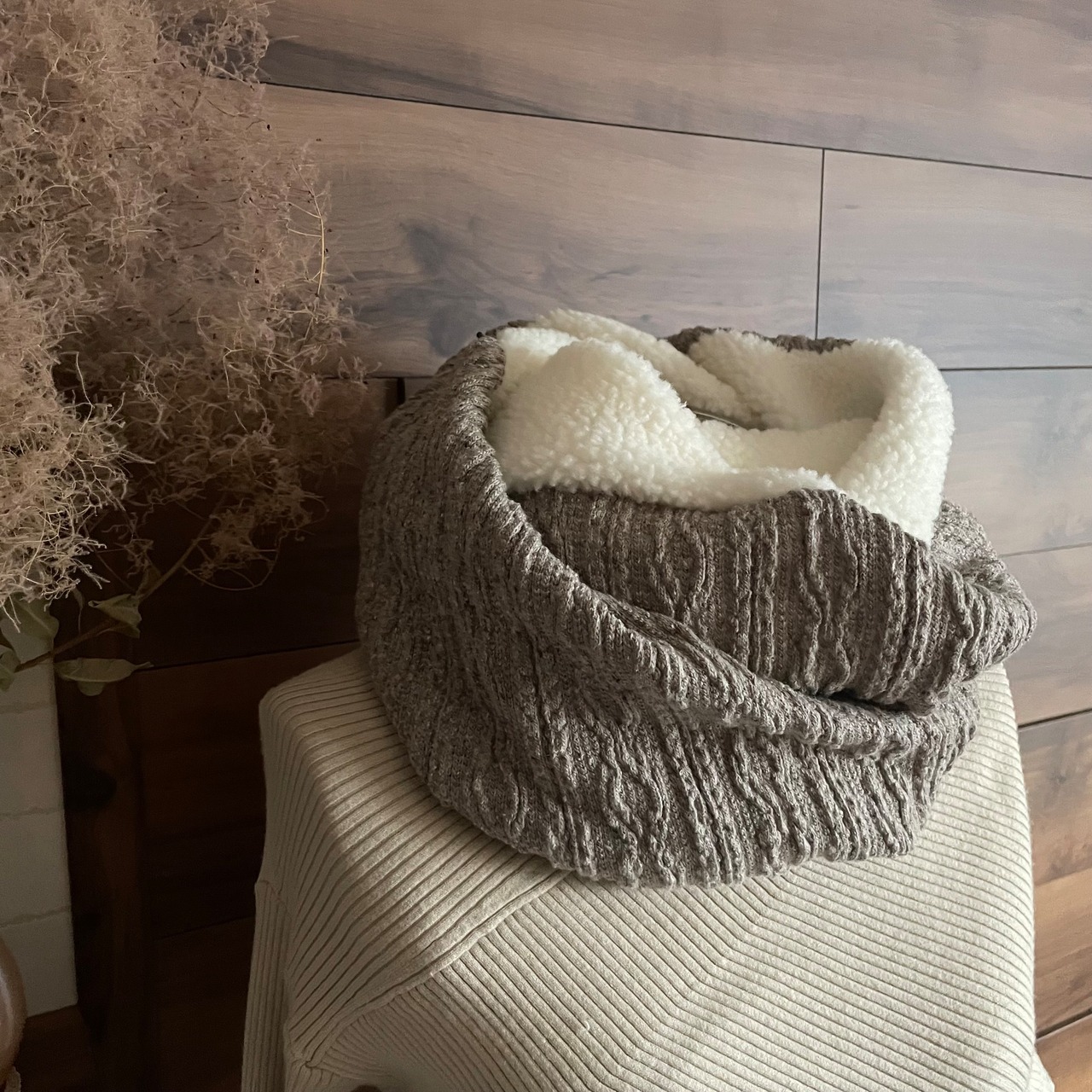 弾力のある上質なシープボアとアランニットを組み合わせ、ねじりをかけたことで色々な表情をお楽しみいただけます。